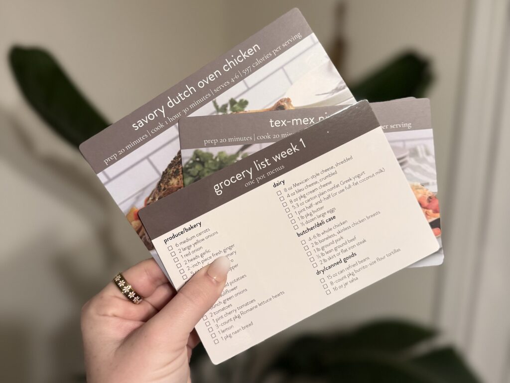 Each week comes with a shopping list and recipe cards. I bought the One-Pot recipes because the easier the better for me. Not because I can’t cook…. (I mean, Bryan says I cook well) but because I like quick and efficient! I am not trying to make 4 course meals each night. #sorrynotsorry